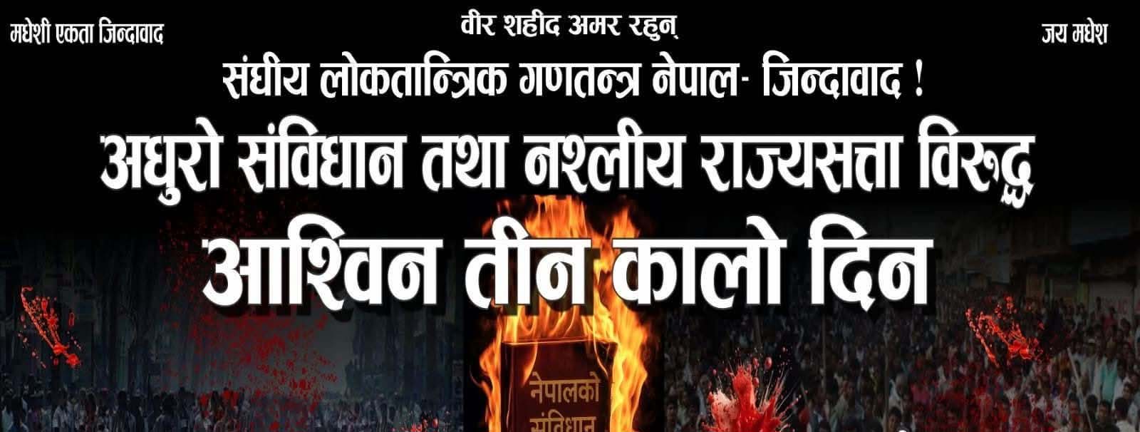 मधेस केन्द्रित राजनीतिक दलले असोज ३ गतेलाई कालो दिन भनेको छ । मोर्चाले नेपालको संविधान २०७२ लाई अधुरो संविधान तथा नश्लीय राज्यसत्ता विरुद्ध असोज ३ लाई कालो दिन भनेको छ । २०७२ असोज ३ गते नेपालको संविधान जारी भएको थियो । संविधान जारी भइरहँदा मधेसवादी दल सडक आन्दोलनमा उत्रिएका थिए ।