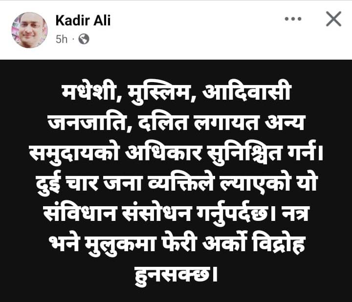 मधेसी, मुस्लिम, आदिवासी, जनजाति र दलितलाई बराबर अधिकारको ग्यारेन्टी गर्न संविधान संशोधन एक मात्र आवश्यकता रहेको बताए ।