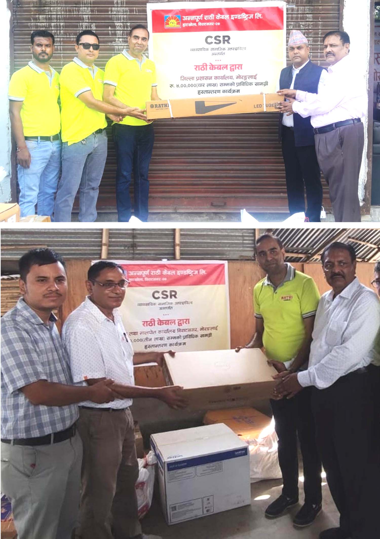 अन्नपूर्ण राठी केबल इण्डष्ट्रिजका अध्यक्ष जितेन्द्र राठी र प्रबन्ध निर्देशक श्याम राठीले बुधबार मोरङका प्रमुख जिल्ला अधिकारी इन्द्रदेव यादवलाई ४ लाख रुपैयाँ बराबरको विद्युतीय सामग्री हस्तान्तरण गरे ।