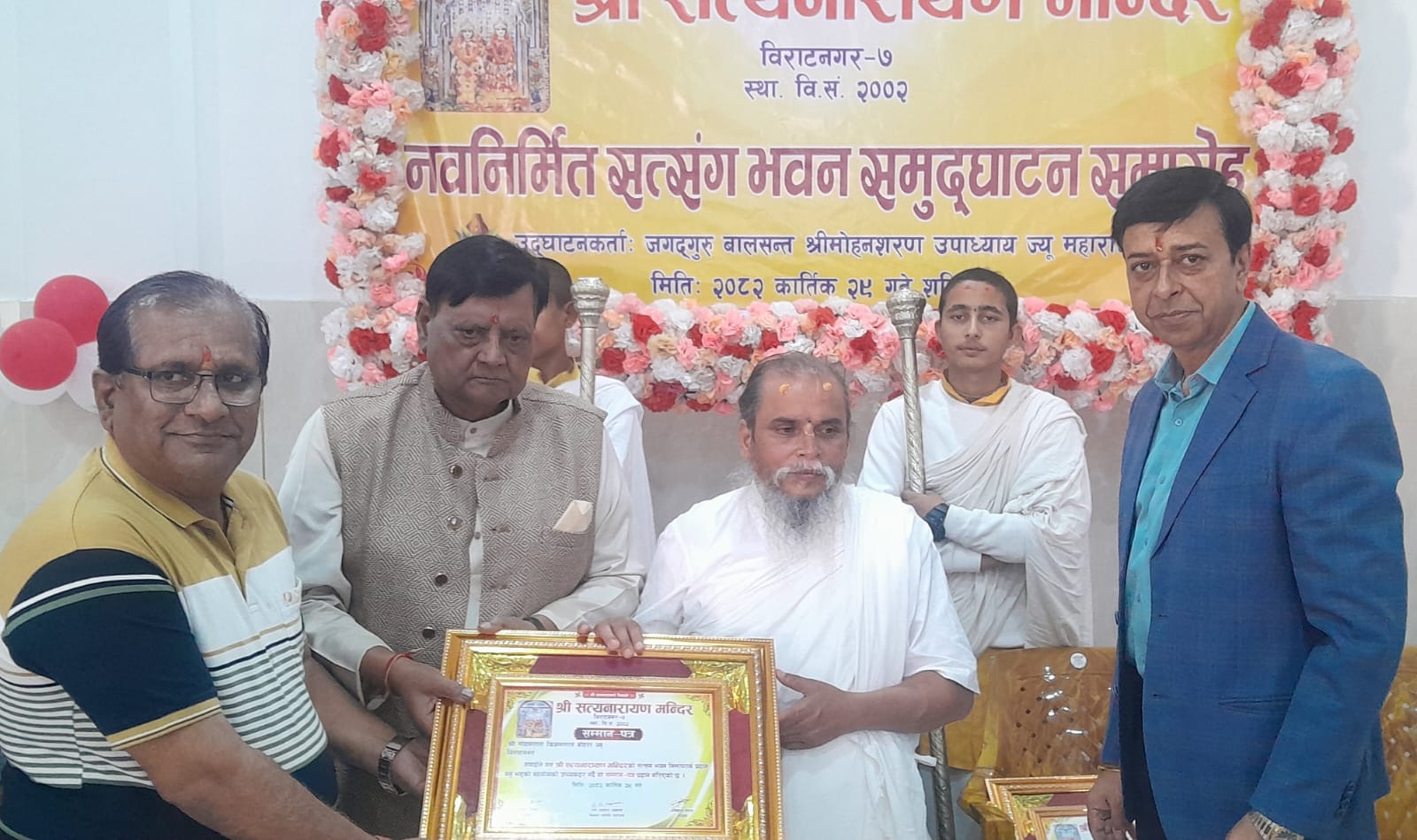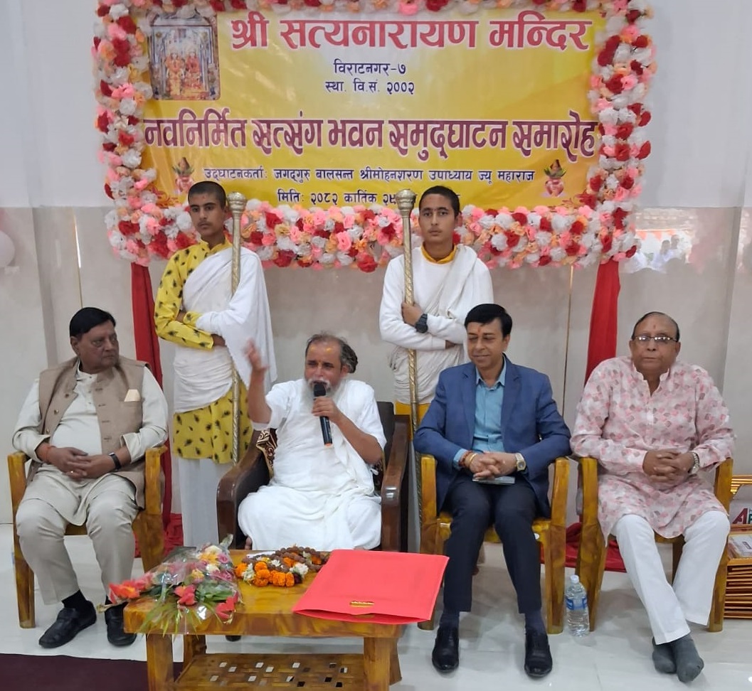 जगदगुरु बालसन्त मोहन शरण उपाध्यायले शनिबार विराटनगरमा नवनिर्मित सत्संग भवनको उद्घाटन गरेका छन् । जगदगुरु बालसन्त मोहन शरण उपाध्याय, सत्यनारायण मन्दिरका अध्यक्ष अविनाश बोहरा, मन्दिर संरक्षक मण्डलका अध्यक्ष शंकरलाल अग्रवाल, सत्संग भवन निर्माण समितिका संयोजक रामअवतार अग्रवाल र मन्दिरका सचिव राजेन्द्र करवाले सत्संग भवन निर्माणका लागि सहयोग गर्ने दाताहरूलाई सम्मान पत्र प्रदान गर्नु भएको थियो ।