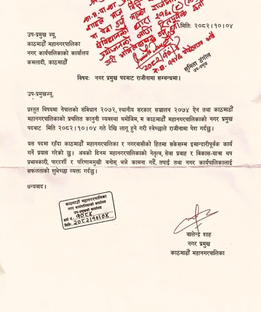 उपमेयर सुनिता डंगोल समक्ष पेस गरिएको बालेनको राजीनामा स्वीकृत भइसको छ । साढे ३ वर्ष काठमाडौंको मेयर रहेका बालेन साह चर्चित राजनीतिककर्मी हुन् ।