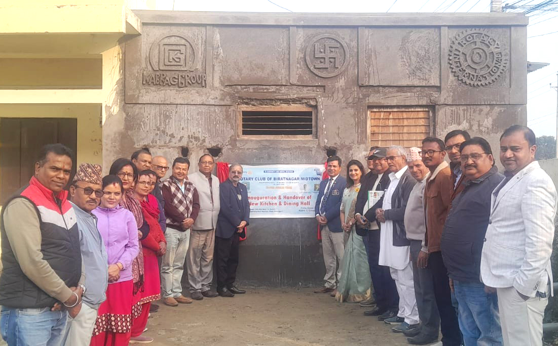 रोटरी क्लब ३२९२ का डिष्ट्रिक गभर्नर विनोद कोइराला, क्लबका असिस्टेन्ट गभर्नर प्रिया सारडा र रोटरी क्लब अफ विराटनगर मिड टाउनका अध्यक्ष उद्योगी एवं समाजसेवी घनश्याम काबराले आइतबार विद्यालयमा निर्माण गरिएको नयाँ भान्सा घर भवनको उद्घाटन गर्दै विद्यालयका प्रधानाध्यापक बेदनिधि भट्टराईलाई भवन हस्तान्तरण गरेका छन् ।