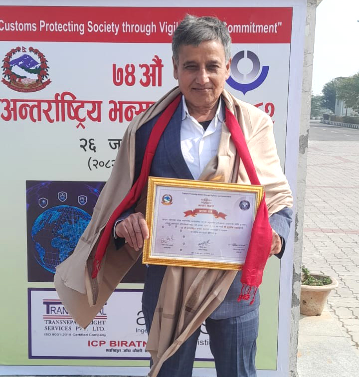 ७४औं अन्तर्राष्ट्रिय भन्सार दिवसको अवसरमा विराटनगर भन्सार कार्यालयले सोमबार आयोजना गरेको पुरस्कार वितरण तथा समापन समारोहमा भन्सार एजेन्ट दाहाललाई उत्कृष्ट भन्सार एजेन्टको पुरस्कार प्रदान गरिएको हो ।