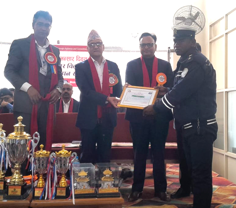 कार्यक्रममा ट्रान्स नेपाल विराटनगर शाखा प्रमुख लक्ष्मी सुब्बा र ट्राफिक प्रहरी रानी पोष्टका प्रमुख प्रहरी नायब निरीक्षक रुपचन्द चौधरीलाई प्रशंसा–पत्र प्रदान गरेका थिए ।