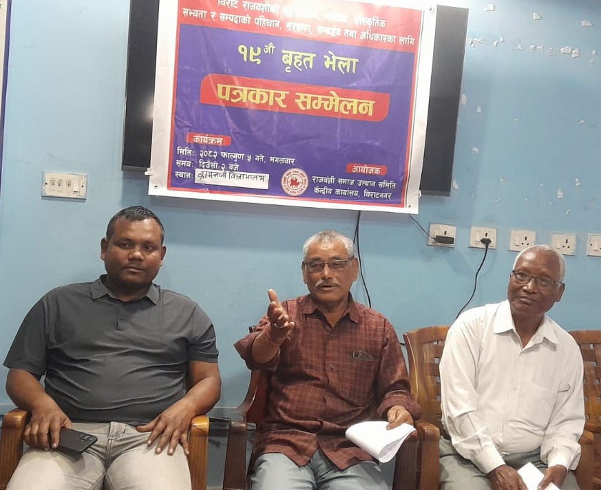 समाजका केन्द्रीय अध्यक्ष भुवनेश्वर मण्डल राजवंशीले मंगलबार पत्रकार सम्मेलन गरेर बुधबार विराटनगर–१ पोखरीयास्थित विष्णुमाया पुस्तकालयमा आयोजना गर्न लागेको १९औं बृहत भेलामा राजनीतिक दलका नेताहरूलाई नबोलाइएको बताए ।