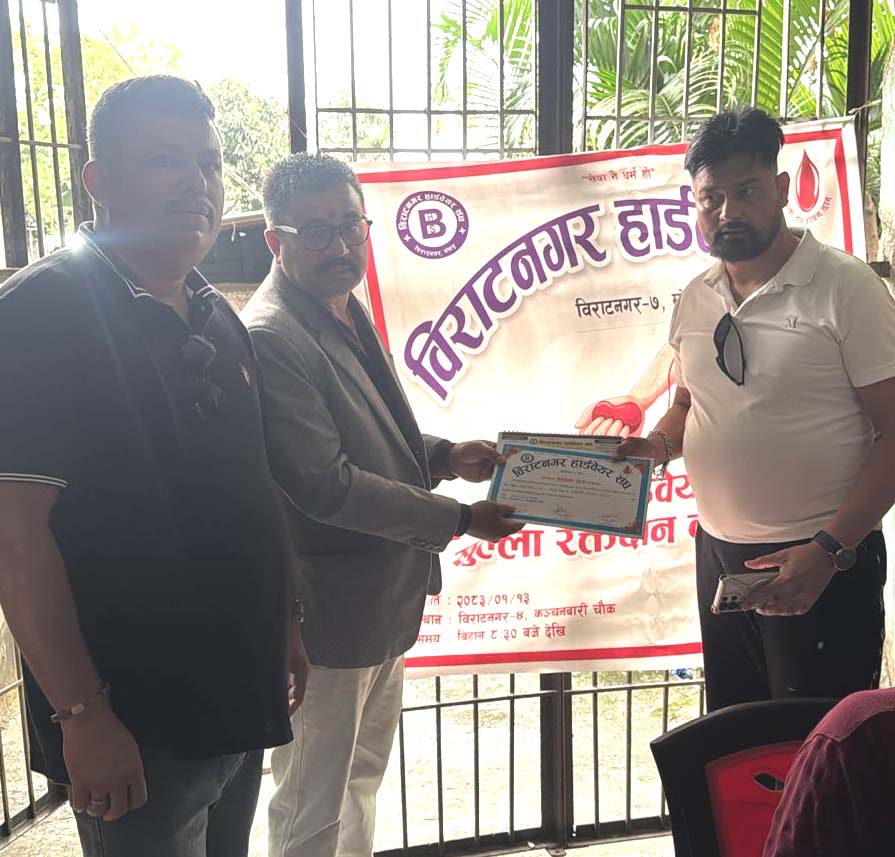 विराटनगर हार्डवेयर संघले आइतबार आयोजना गरेको रक्तदान कार्यक्रममा ५० जनाले रक्तदान गरेका छन् ।
